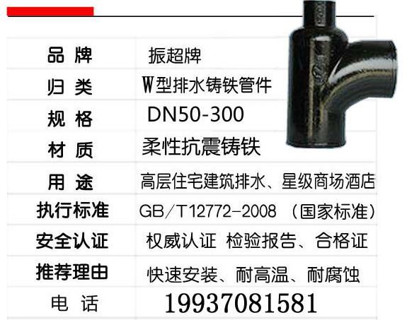 W型鑄鐵排水管件,柔性抗震鑄鐵,快速安裝,耐高溫,耐腐蝕;用于高層住宅建筑排水、星際商場酒店。