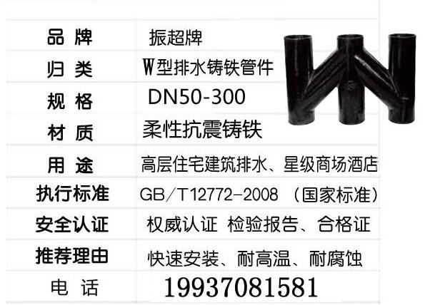 振超牌W型鑄鐵排水管件,柔性抗震鑄鐵,快速安裝,耐高溫,耐腐蝕;用于高層住宅建筑排水、星際商場酒店。